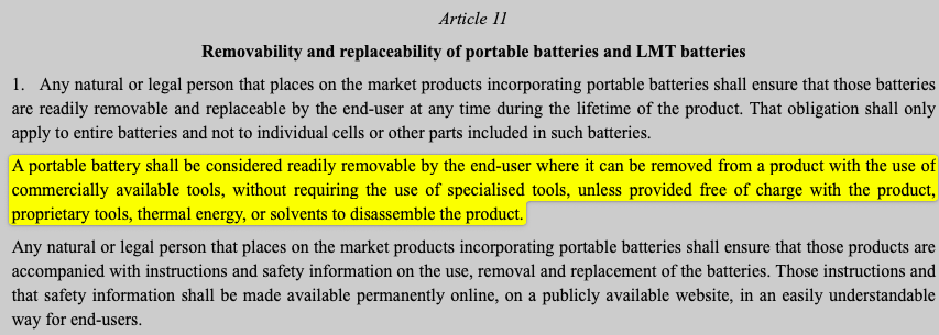 「如果最终用户可以使用市售工具将便携式电池从产品中取出,而不需要使用专门工具(除非随产品免费提供)、专有工具、热能或溶剂来拆解产品,则该便携式电池应被视为最终用户易于拆卸的电池。」