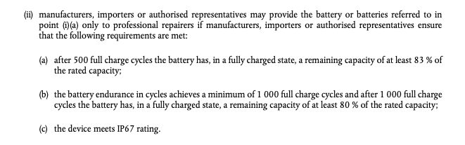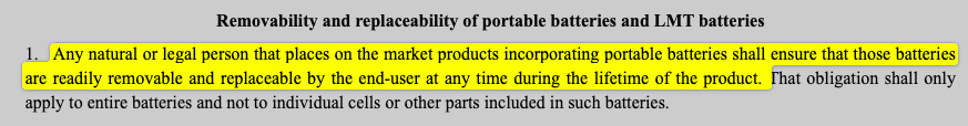 其中就提及「用户必须能随时轻松拆卸和更换电池」。